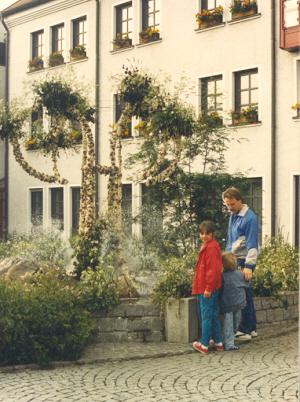![]() Fountain-decorating festival in Southern Germany - Brunnenfest. Note the flowers in the windows, the brick sidewalk, the need for my favorite Puma jacket mid-summer. Wunsiedel? |