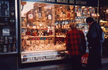 ![]() They really do have a lot of watches in Switzerland. The shop windows glittered in gold. Notice the cuckoo clocks to the left. I also bought a few giant blocks of Toblerone chocolate and several Swiss Army knives as gifts; I found out they were cheaper back in the states, when I got back home. My German was much improved and I was much richer for all the experiences of this trip. |