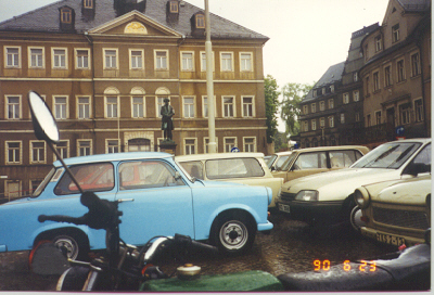 ![]() The colors of the former German Democratic Republic. Trabant autos, soot-stained buildings. Lunch with my old comrade, Herr D after a visit to the Steinbruch of his hometown near Chemnitz (formerly Karl-Marx-Stadt) | |