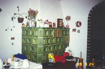 ![]() Beautiful ceramic tile ovens (Kachelofen) in many German homes. I took this photo when visiting my former guest family in Cologne. They often heated the TV room with this oven. Make sure you close all the doors! | |