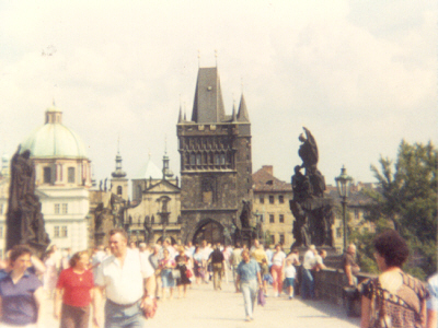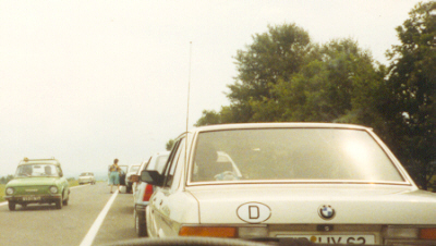 ![]() July 1, 1990 - first day visas weren't needed to cross into Czechoslovakia. We want in, but they want out! Note the old cars (Skolas) driving towards us, that is out of the CssR and into Germany. We're in a massive red BMW station wagon, by the way. | |